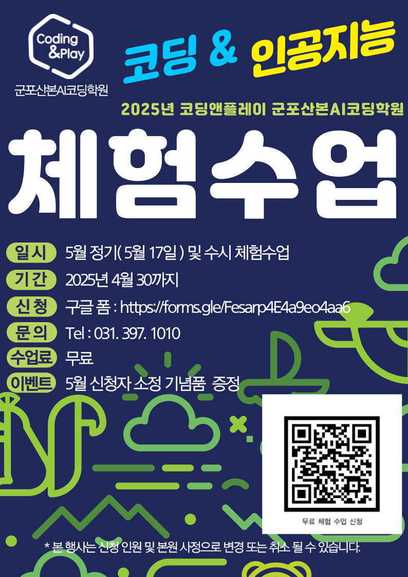 코딩앤플레이 군포산본AI코딩학원 체험수업 신청 (5월 정기 체험수업: 2025년 5월 17일 및 수시 체