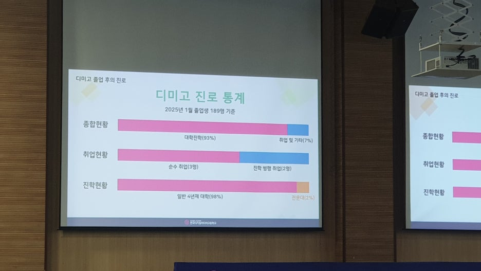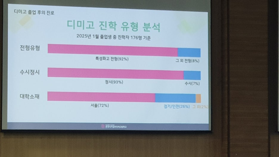디미고는 대학 진학률이(93%) 높은데 진학생의 70%가량이 수도권 10대 대학으로 진학 한다고 하네요.