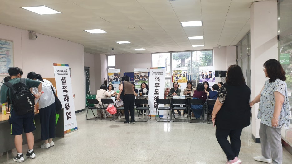 학생과 학부모님들께서 신청자 확인 및 상담을 진행해 주시고 있는 모습 이예요.