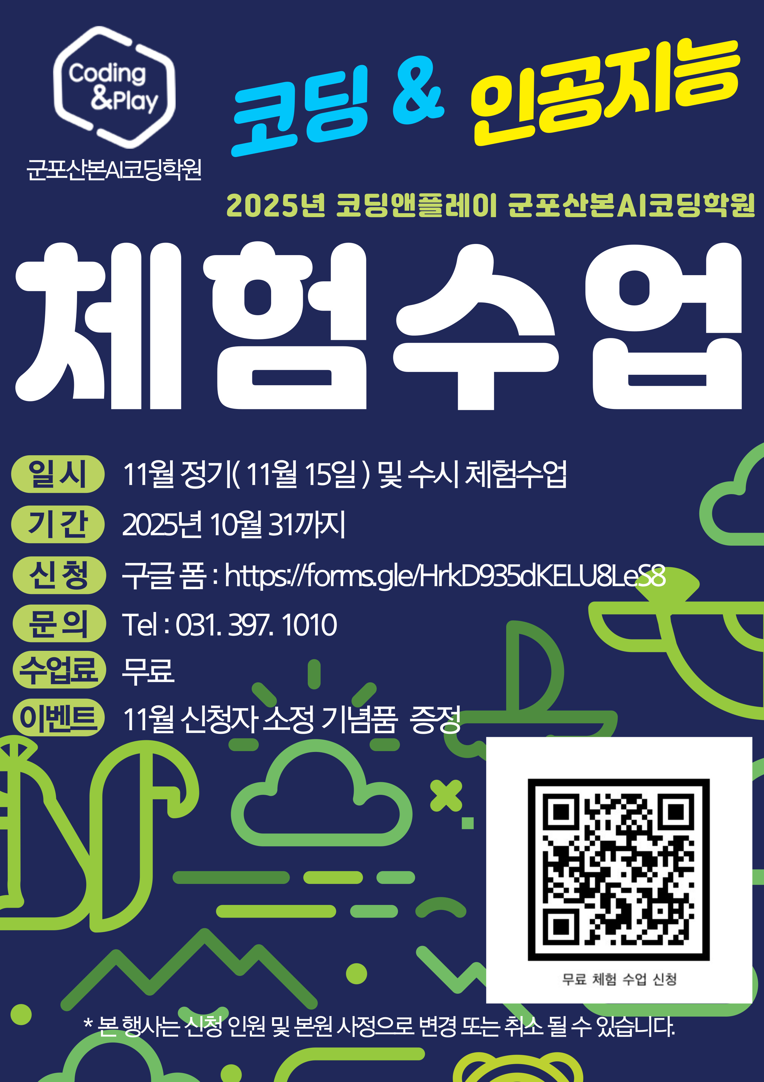 코딩앤플레이 군포산본AI코딩학원 체험수업 신청 (11월 정기 체험수업: 2025년 11월 15일 및 수시