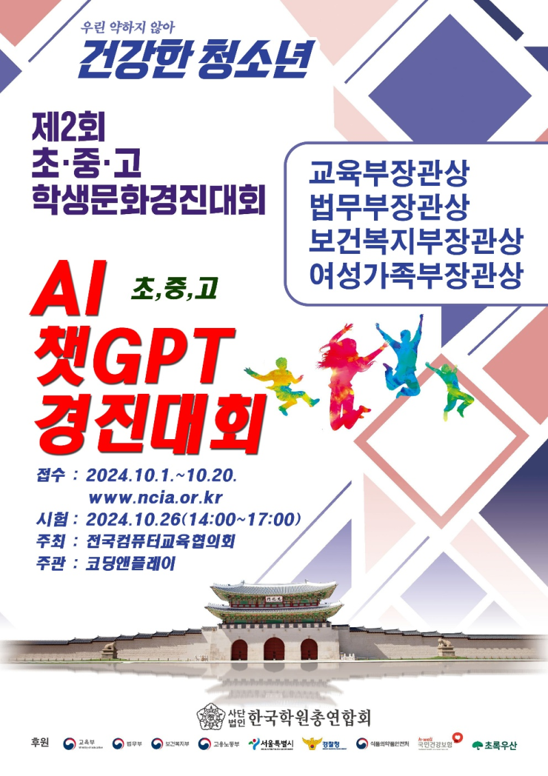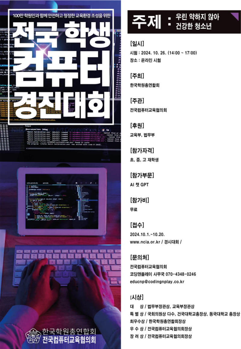 | [코딩앤플레이 군포산본AI코딩학원(Coding & Play Gunpo) - 공모전 및 행사]-국내 최대규모 전국학생코딩경진대회 내달 26일 개최 (10) | 2024.09.23 |