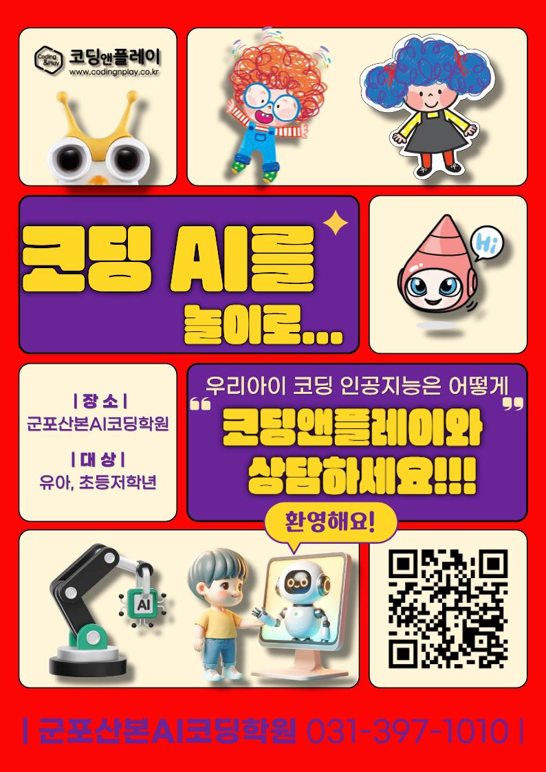 자세한 사항이 궁금하다면!!!^^[코딩앤플레이 군포산본AI코딩학원]우리 아이 첫 코딩 교육!!!코딩교육 처음 부터 제대로코딩앤플레이 군포산본AI코딩학원에서 시작하세요.^^[상담/문의]TEL : 031-397-1010https://blog.naver.com/gpcoding 코딩과 AI를 놀이로... 군포산본AI코딩학원과 상담하세요!!!(유아 및 초등 저학년)※ 학원 관련 문의 사항 ※인스타그램 https://www.instagram.com/gunpo_codingnplay/카카오채널 http://pf.kakao.com/_dcGDxb카카오채널 친구추가 http://pf.kakao.com/_dcGDxb/friend유튜브 https://www.youtube.com/@군포산본AI코딩학원문의 전화 : 031-397-..